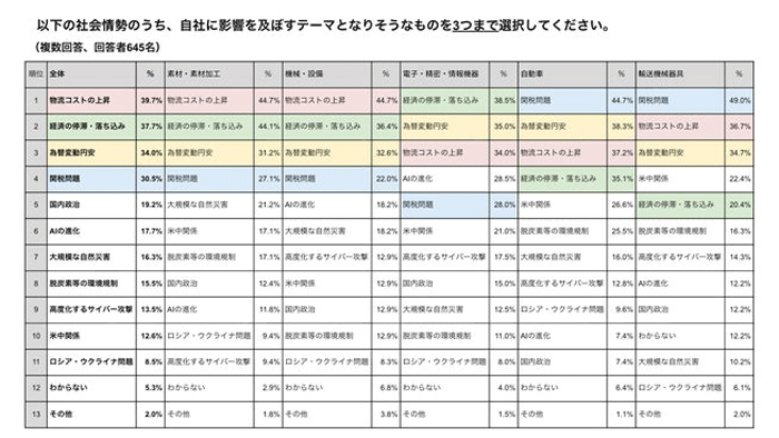 製造業管理職に聞く/「物流コストの上昇」が影響のある社会情勢の1位に