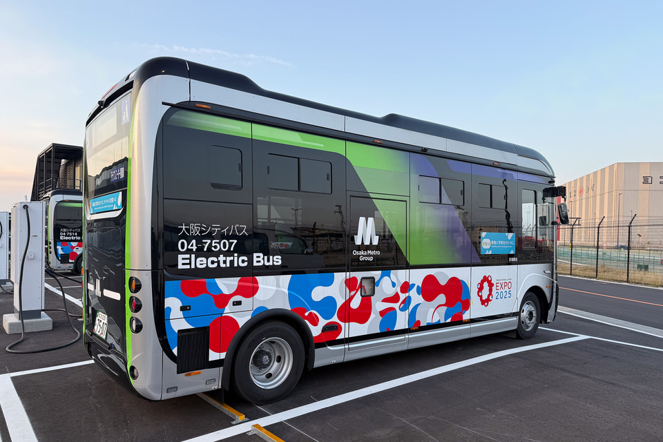 大阪・関西万博で使われた電気自動車(EV)バス。北九州市のEVモーターズ・ジャパン(EVMJ)から調達した(大阪市城東区で、1月7日)=読売ヘリから : EVモーターズが民事再生法の適用申請、負債総額57億円…万博バスで不具合・資金繰りに懸念:写真